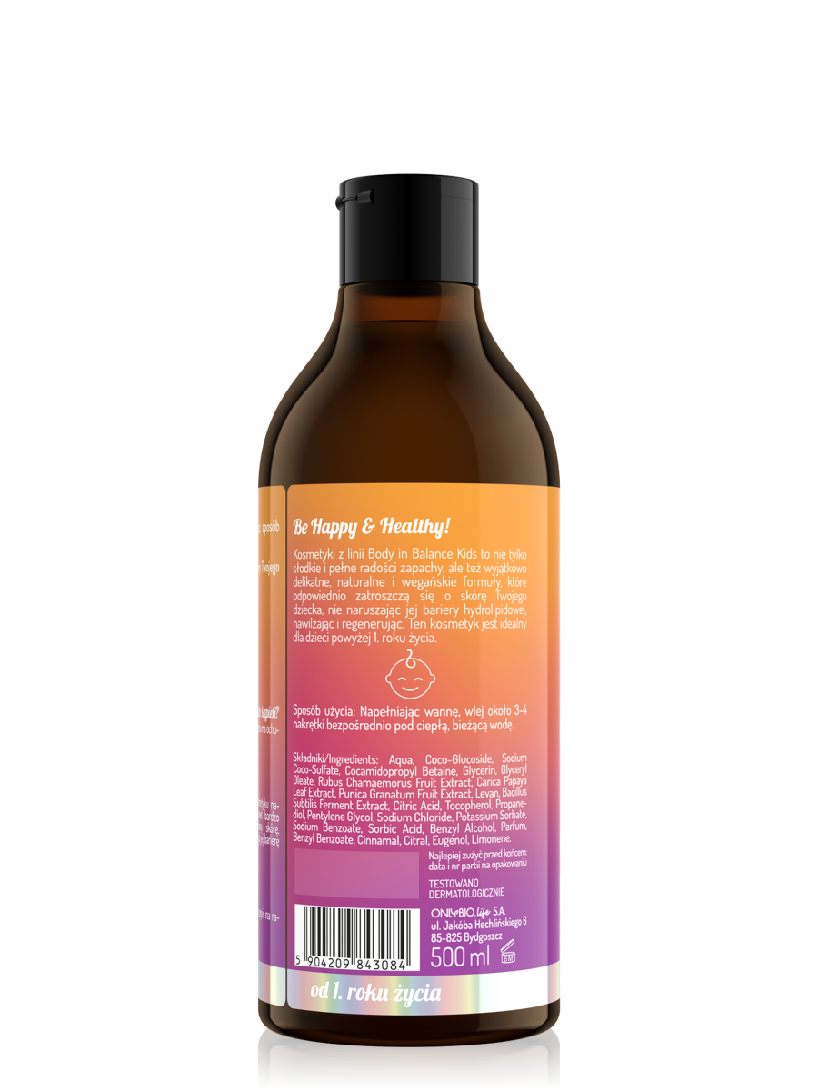 Czy da się zamknąć radość i uśmiech w buteleczce? Onlybio się to udało! Płyn do kąpieli dla dzieci Body in Balance Kids to wyjątkowy kosmetyk, który zachęca do zabawy słodkim zapachem. Jego nowoczesna, wegańska formuła zawiera aż 98% składników pochodzenia naturalnego, odpowiednio pielęgnujących wymagającą skórę najmłodszych. Nawadniają ją, regenerują oraz stymulują rozwój pożytecznej flory bakteryjnej.
