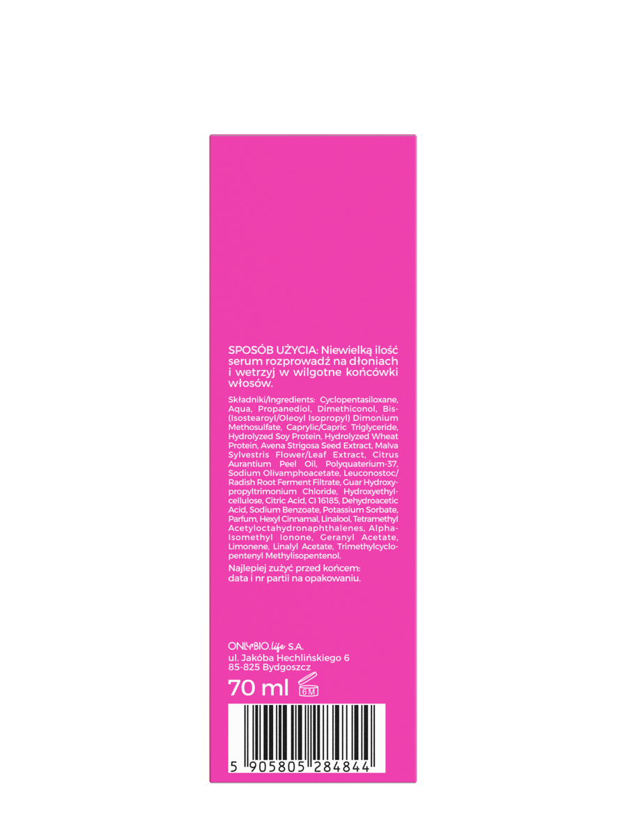 Niewielką ilość serum rozprowadź na dłoniach i wetrzyj w wilgotne końcówki włosów.