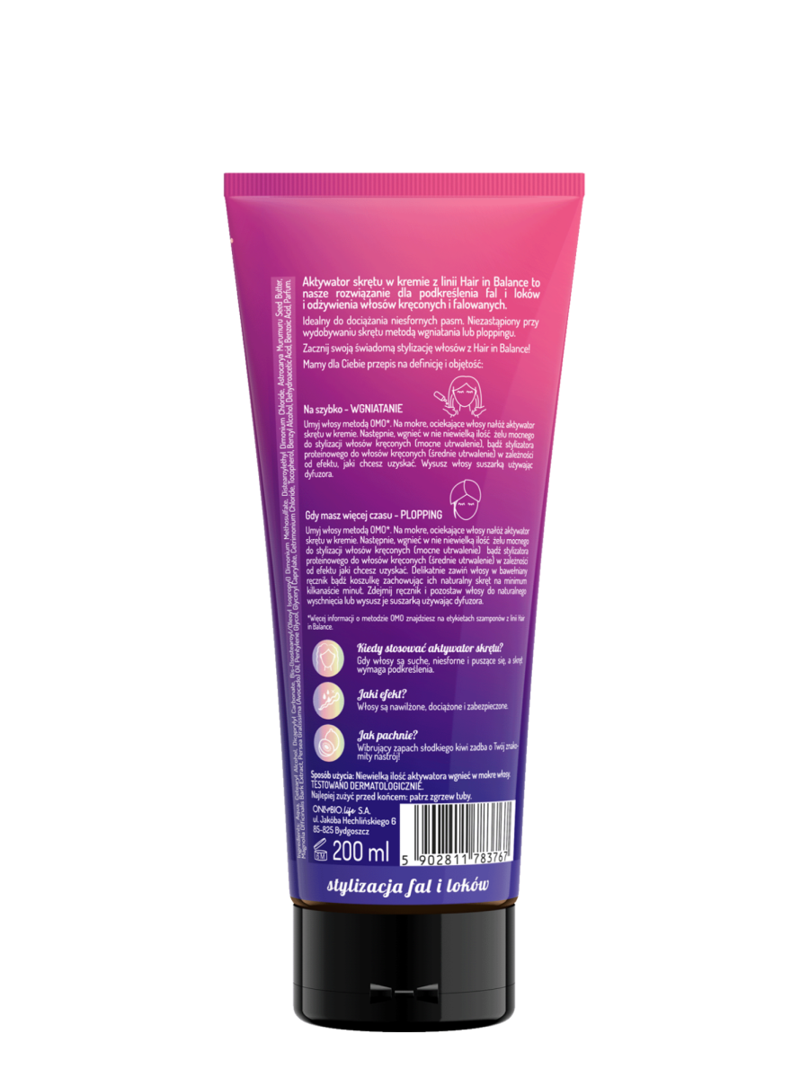 W umyte, ociekające wodą włosy wgnieć niewielką ilość aktywatora, dokładnego go rozprowadzając. Dla uzyskania najlepszego rezultatu wysusz włosy przy pomocy suszarki z dyfuzorem.