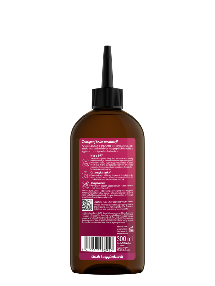 Zatrzymaj kolor na dłużej! Kwasowa płukanka przywraca włosom naturalne pH, zamyka łuski, podkreśla kolor, nadaje spektakularny blask, wygładza i chroni przed uszkodzeniami.