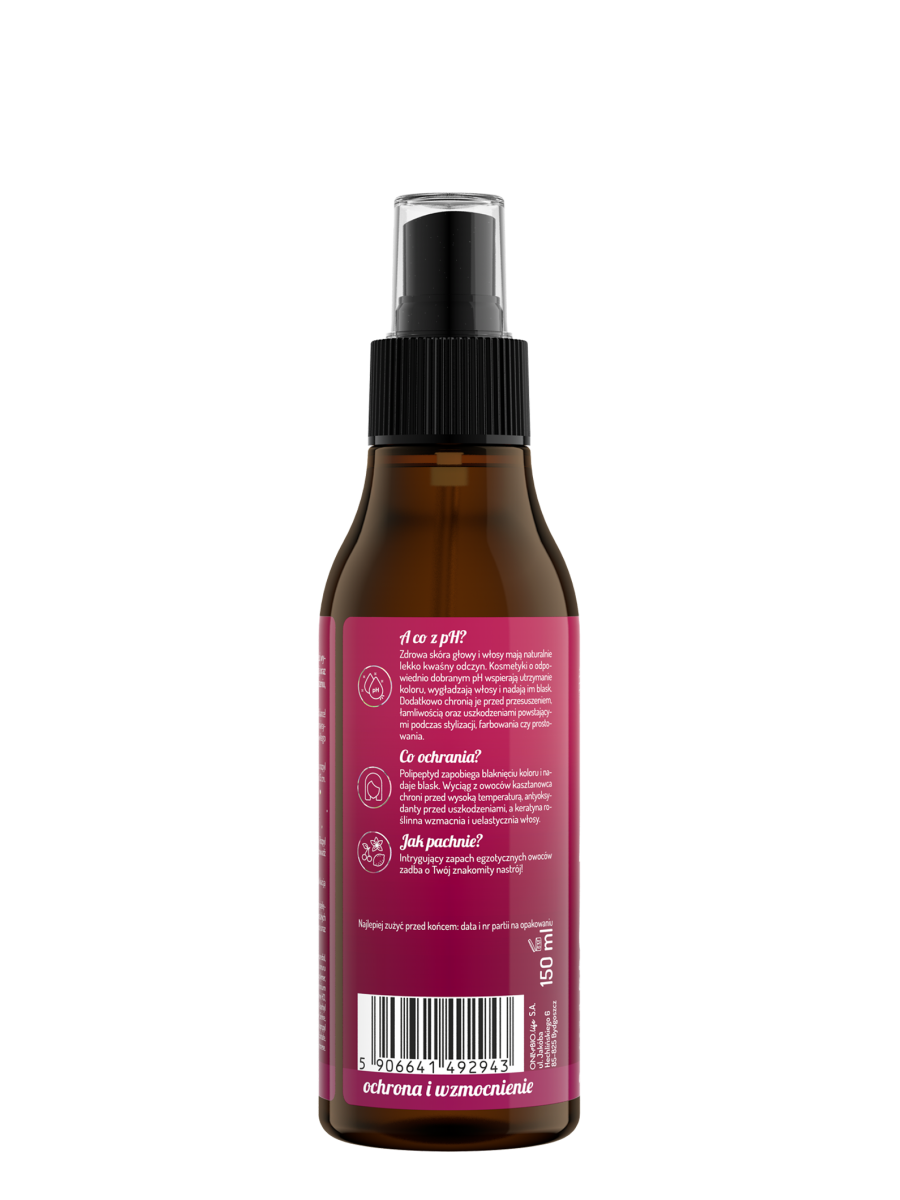 Termoochrona zabezpiecza włosy przed wysokimi temperaturami podczas stylizacji oraz promieniowaniem UV. Zapobiega przesuszeniu, uszkodzeniom i blaknięciu koloru. Zacznij swoją świadomą pielęgnację z Hair in Balance! Odkryj nasze kwasowe formuły dla efektu maksymalnej intensywności koloru i niesamowitego blasku. A co z pH? Zdrowa skóra głowy i włosy mają naturalnie lekko kwaśny odczyn. Kosmetyki o odpowiednio dobranym pH wspierają utrzymanie koloru, wygładzają włosy i nadają im blask. Dodatkowo chronią je przed przesuszeniem, łamliwością oraz uszkodzeniami powstającymi podczas stylizacji, farbowania czy prostowania.