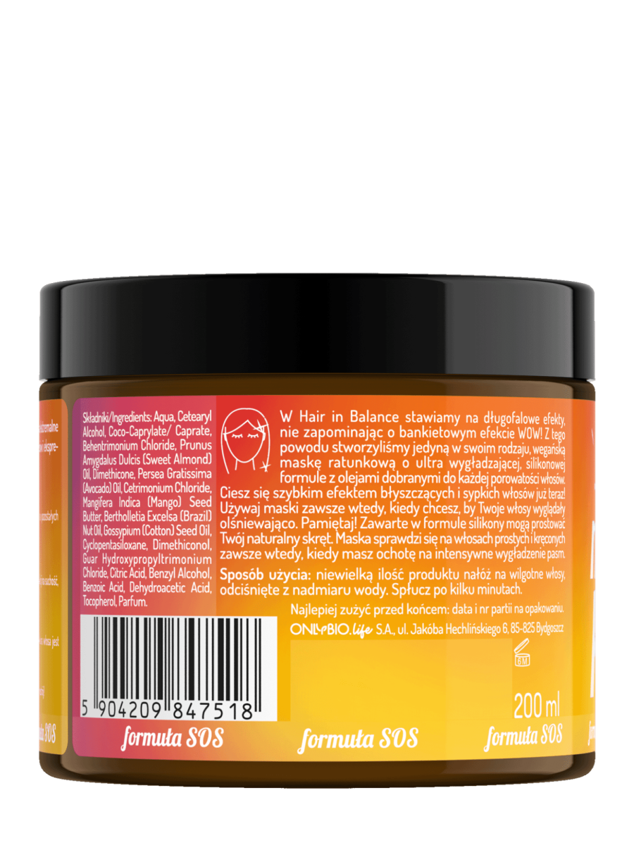 Maska ratunkowa z linii Hair in Balance to nasz sposób na ekstremalne wygładzenie, natychmiastowe poprawienie wyglądu włosów i ekspresowy efekt taflii. Naturalna, wegańska formuła z masłem mango, olejem z orzechów brazylijskich, nasion bawełny i silikonami.