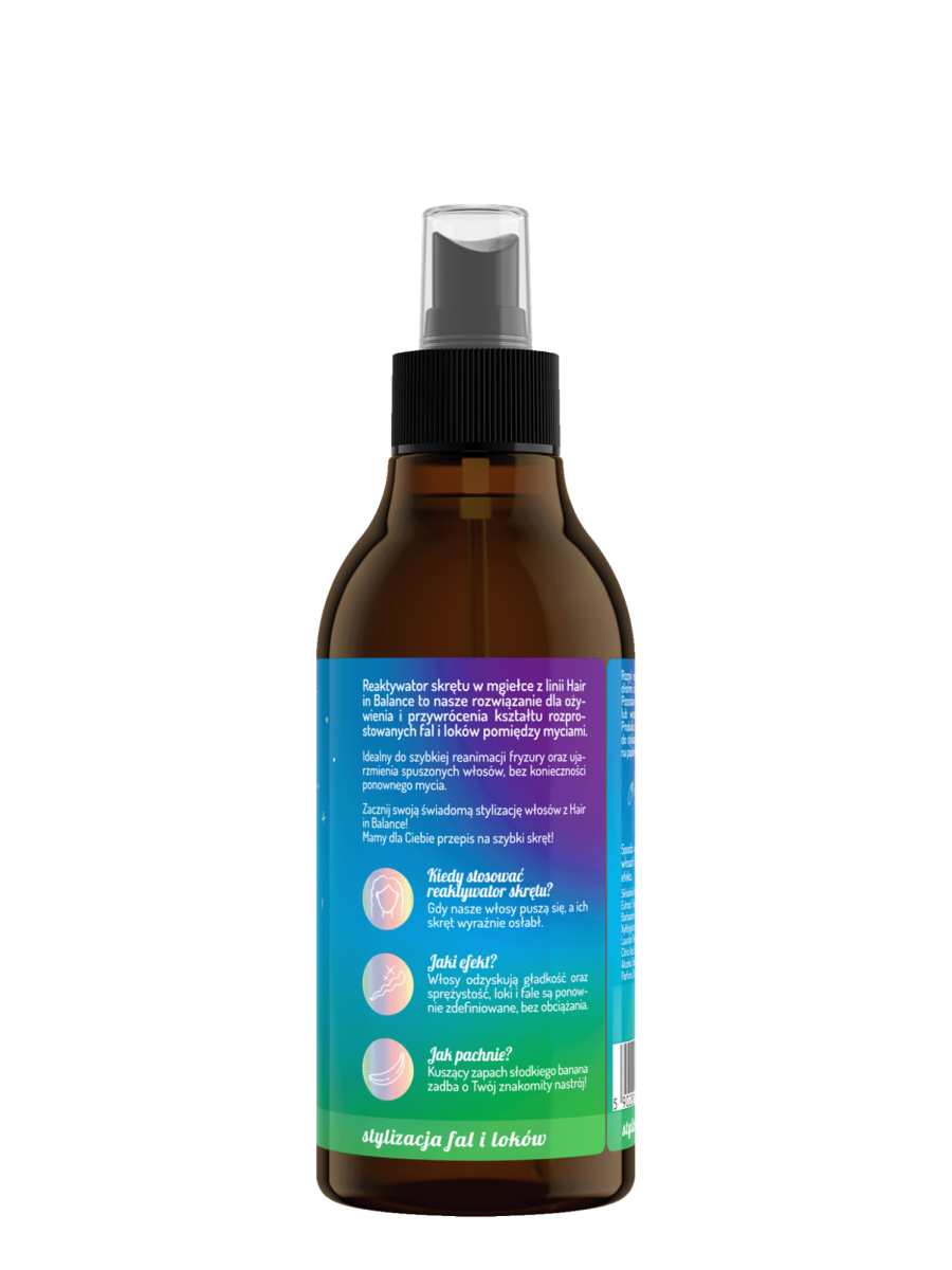Kochasz swoje loki lub fale zaraz po stylizacji, ale z upływem czasu Twoje zadowolenie maleje? Ten scenariusz nie musi Cię już dotyczyć. Użyj reaktywatora skrętu z linii Hair in Balance od Onlybio i przywróć rozprostowanym włosom ulubiony kształt. Nie musisz czekać do następnego mycia – produkt ma formułę mgiełki, która przynosi natychmiastowe efekty. Łatwo się aplikuje i nie obciąża włosów. W jego składzie nie znajdziesz silikonów.
