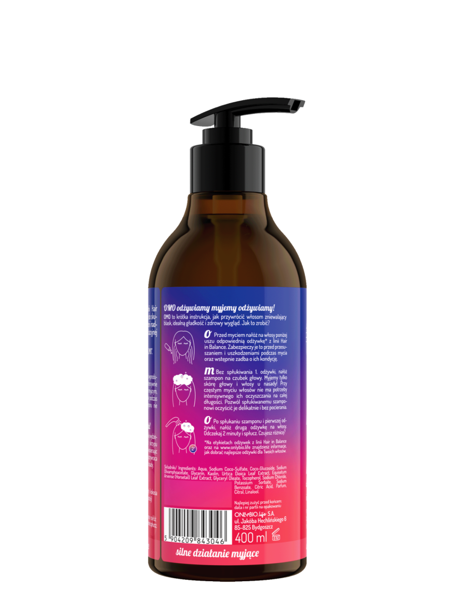 Niewielką ilość szamponu delikatnie wmasuj w skórę głowy. Jeżeli często myjesz włosy, nie musisz dokładnie oczyszczać ich na całej długości – zrobi to piana spływająca podczas spłukiwania szamponu. Produkt idealnie sprawdzi się do metody OMO.