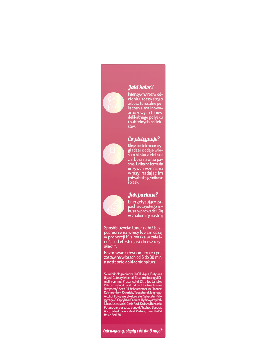 Składniki/Ingredients (INCI): Aqua, Butylene Glycol, Cetearyl Alcohol, Stearamidopropyl Dimethylamine, Propanediol, Citrullus Lanatus (Watermelon) Fruit Extract, Rubus Idaeus (Raspberry) Seed Oil, Behentrimonium Chloride, Cetrimonium Chloride, Tocopherol, Isopropyl Alcohol, Polyglyceryl-4 Laurate/Sebacate, Polyglyceryl-6 Caprylate/Caprate, Hydroxyethylcellulose, Lactic Acid, Citric Acid, Sodium Benzoate, Potassium Sorbate, Benzyl Alcohol, Benzoic Acid, Dehydroacetic Acid, Parfum, Basic Red 51, Basic Red 76