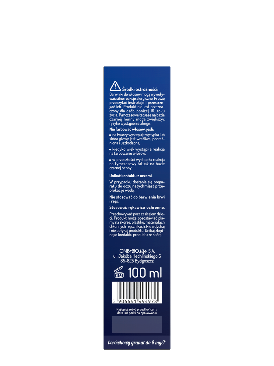 Barwniki do włosów mogą wywoływać silne reakcje alergiczne. Proszę przeczytać instrukcje i przestrzegać ich. Produkt nie jest przeznaczony dla osób poniżej 16 roku życia. Tymczasowe tatuaże na bazie czarnej henny mogą zwiększyć ryzyko wystąpienia alergii. Nie farbować włosów jeśli: na twarzy występuje wysypka lub skóra głowy jest wrażliwa, podrażniona i uszkodzona, kiedykolwiek wystąpiła reakcja na farbowanie włosów, w przeszłości wystąpiła reakcja na tymczasowy tatuaż na bazie czarnej henny. Unikać kontaktu z oczami. W przypadku dostania się preparatu do oczu natychmiast przepłukać je wodą. Nie stosować do barwienia brwi i rzęs. Stosować rękawice ochronne. Przechowywać poza zasięgiem dzieci. Produkt może pozostawiać plamy na skórze, plastiku, materiałach chłonnych i ręcznikach. Nie wdychaj i nie połykaj produktu. Unikaj zbędnego kontaktu produktu ze skórą.