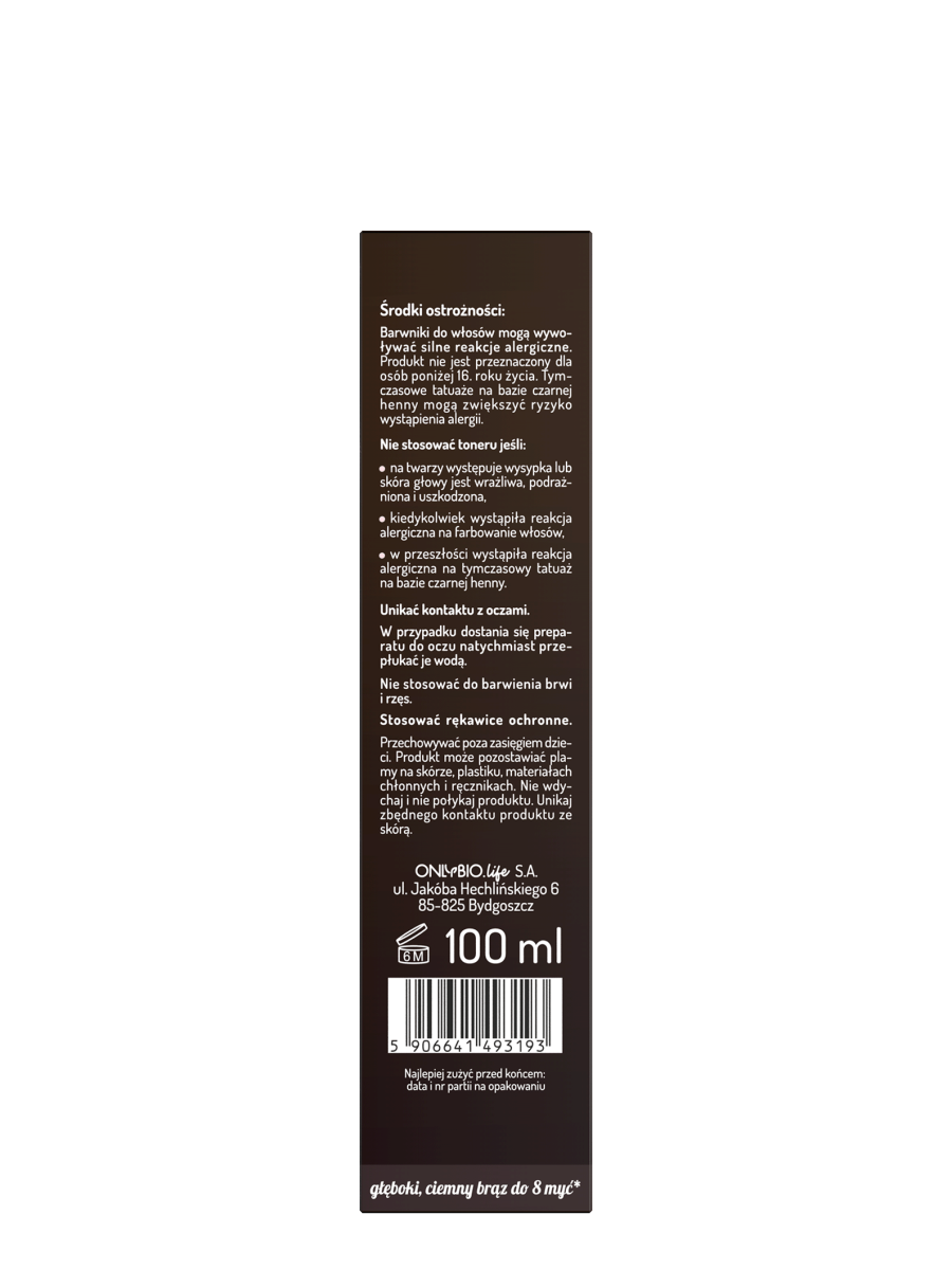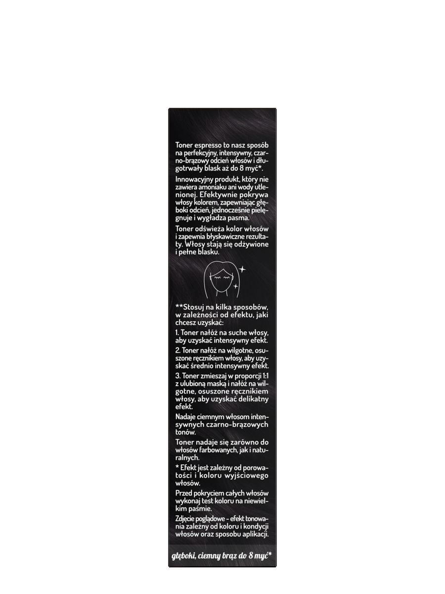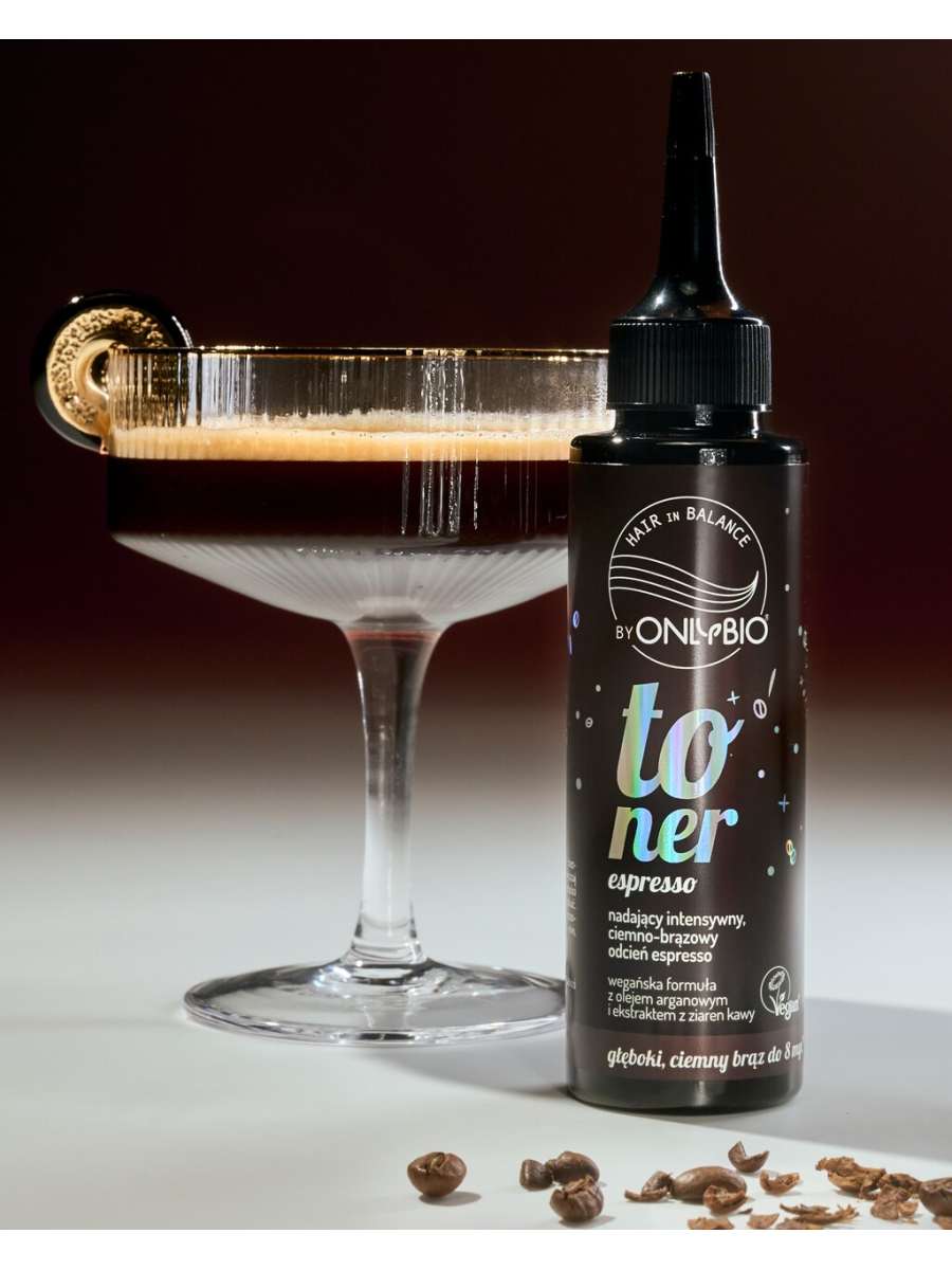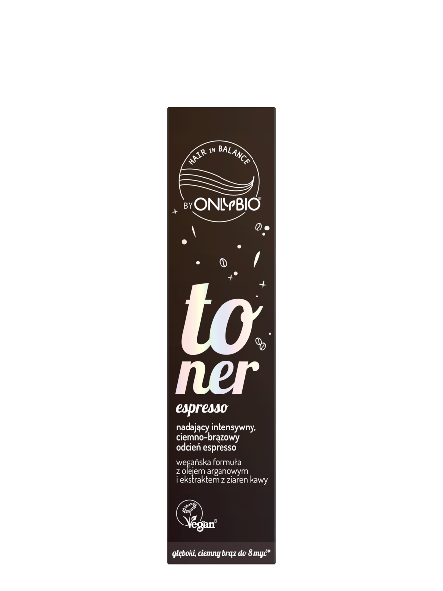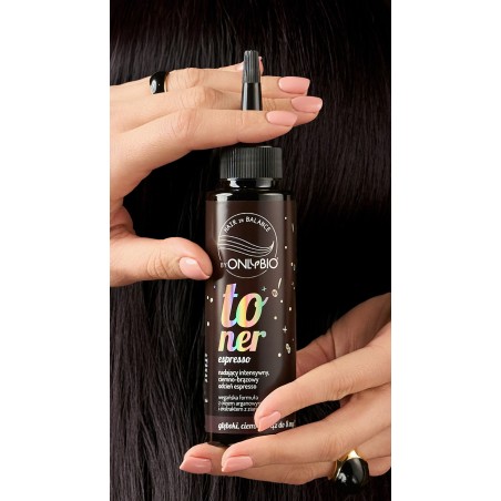 Toner do brązowych włosów OnlyBio Hair in Balance, który odświeża kolor, nadając włosom intensywny, ciemno-brązowy odcień espresso.