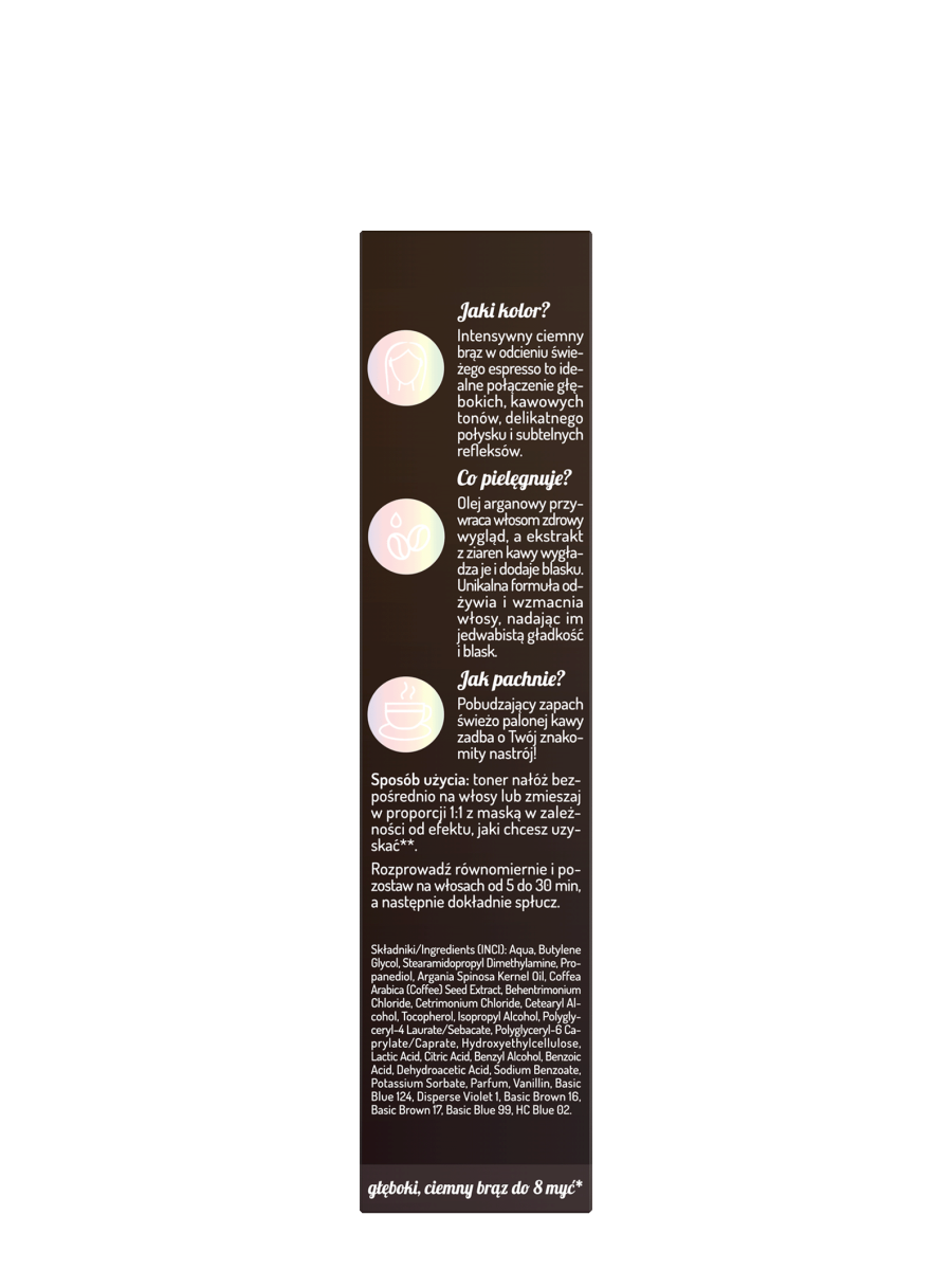 Aqua, Butylene Glycol, Stearamidopropyl Dimethylamine, Propanediol, Argania Spinosa Kernel Oil, Coffea Arabica (Coffee) Seed Extract, Behentrimonium Chloride, Cetrimonium Chloride, Cetearyl Alcohol, Tocopherol, Isopropyl Alcohol, Polyglyceryl-4 Laurate/Sebacate, Polyglyceryl-6 Caprylate/Caprate, Hydroxyethylcellulose, Lactic Acid, Citric Acid, Benzyl Alcohol, Benzoic Acid, Dehydroacetic Acid, Sodium Benzoate, Potassium Sorbate, Parfum, Vanillin, Basic Blue 124, Disperse Violet 1, Basic Brown 16, Basic Brown 17, Basic Blue 99, HC Blue 02.