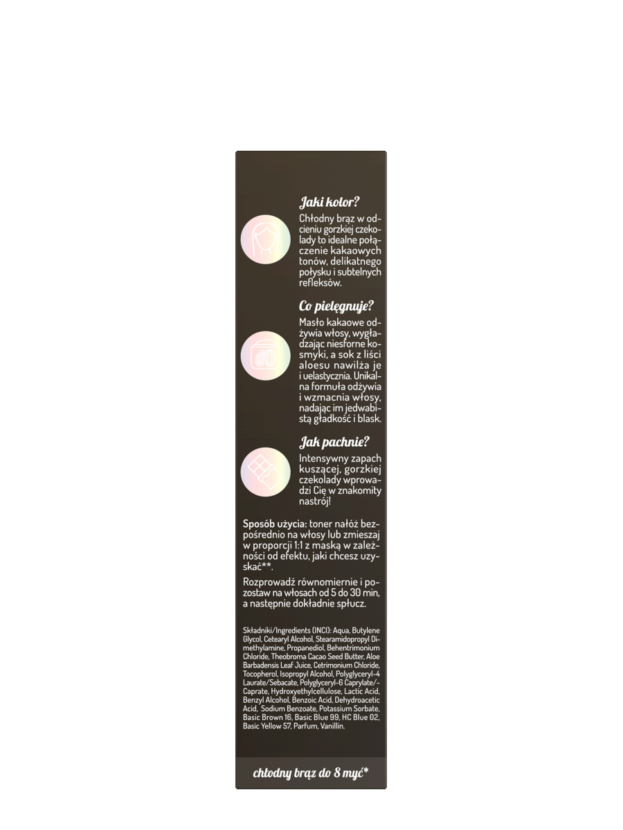 Składniki/Ingredients (INCI): Aqua, Butylene Glycol, Cetearyl Alcohol, Stearamidopropyl Dimethylamine, Propanediol, Behentrimonium Chloride, Theobroma Cacao Seed Butter, Aloe Barbadensis Leaf Juice, Cetrimonium Chloride, Tocopherol, Isopropyl Alcohol, Polyglyceryl-4 Laurate/Sebacate, Polyglyceryl-6 Caprylate/-Caprate, Hydroxyethylcellulose, Lactic Acid, Benzyl Alcohol, Benzoic Acid, Dehydroacetic Acid, Sodium Benzoate, Potassium Sorbate, Basic Brown 16, Basic Blue 99, HC Blue 02, Basic Yellow 57, Parfum, Vanillin.