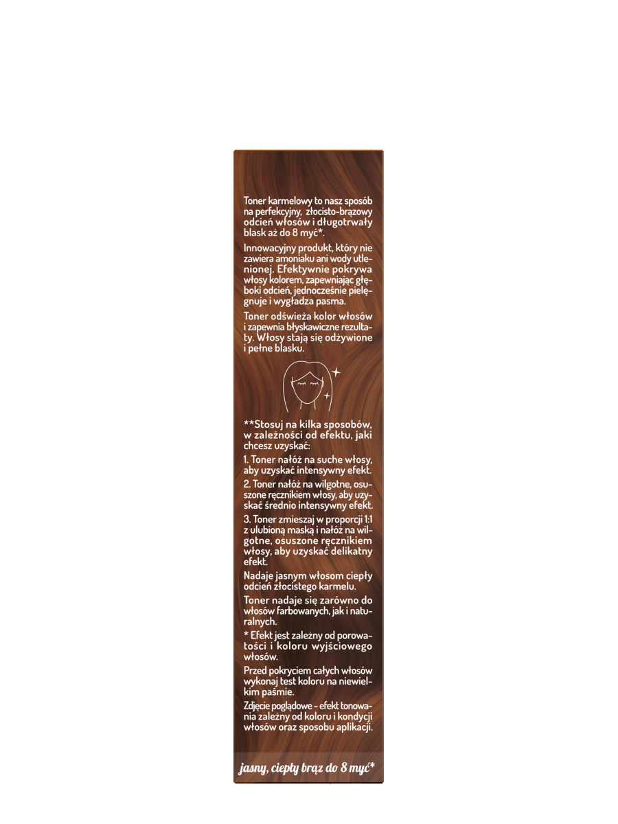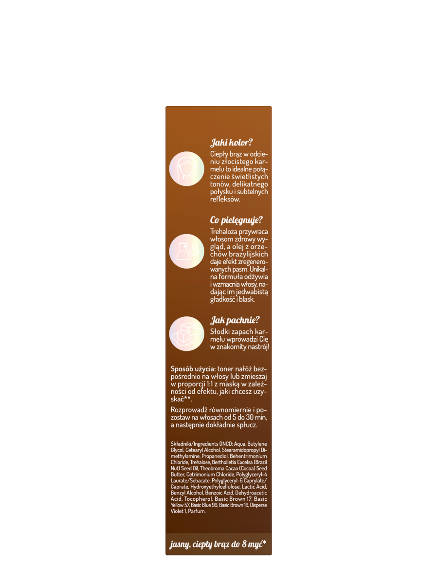 Ciepły brąz w odcieniu złocistego karmelu to idealne połączenie świetlistych tonów, delikatnego połysku i subtelnych refleksów.