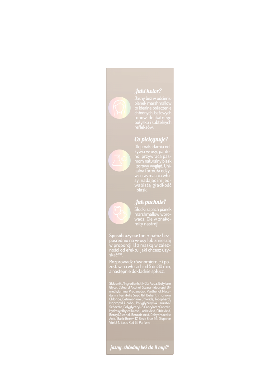 Składniki/Ingredients (INCI): Aqua, Butylene Glycol, Cetearyl Alcohol, Stearamidopropyl Dimethylamine, Propanediol, Panthenol, Macadamia Ternifolia Seed Oil, Behentrimonium Chloride, Cetrimonium Chloride, Tocopherol, Isopropyl Alcohol, Polyglyceryl-4 Laurate/ Sebacate, Polyglyceryl-6 Caprylate/Caprate, Hydroxyethylcellulose, Lactic Acid, Citric Acid, Benzyl Alcohol, Benzoic Acid, Dehydroacetic Acid, Basic Brown 17, Basic Blue 99, Disperse Violet 1, Basic Red 51, Parfum