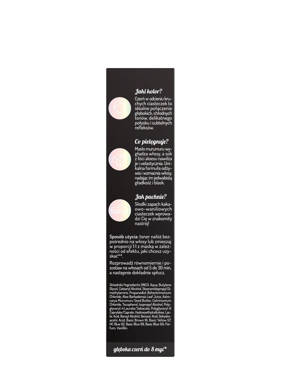 Składniki/Ingredients (INCI): Aqua, Butylene Glycol, Cetearyl Alcohol, Stearamidopropyl Dimethylamine, Propanediol, Behentrimonium Chloride, Aloe Barbadensis Leaf Juice, Astrocarya Murumuru Seed Butter, Cetrimonium Chloride, Tocopherol, Isopropyl Alcohol, Polyglyceryl-4 Laurate/Sebacate, Polyglyceryl-6 Caprylate/Caprate, Hydroxyethylcellulose, Lactic Acid, Benzyl Alcohol, Benzoic Acid, Dehydroacetic Acid, Basic Brown 16, Basic Yellow 57, HC Blue 02, Basic Blue 99, Basic Blue 124, Parfum, VanillinSkładniki/Ingredients (INCI): Aqua, Butylene Glycol, Cetearyl Alcohol, Stearamidopropyl Dimethylamine, Propanediol, Behentrimonium Chloride, Aloe Barbadensis Leaf Juice, Astrocarya Murumuru Seed Butter, Cetrimonium Chloride, Tocopherol, Isopropyl Alcohol, Polyglyceryl-4 Laurate/Sebacate, Polyglyceryl-6 Caprylate/Caprate, Hydroxyethylcellulose, Lactic Acid, Benzyl Alcohol, Benzoic Acid, Dehydroacetic Acid, Basic Brown 16, Basic Yellow 57, HC Blue 02, Basic Blue 99, Basic Blue 124, Parfum, Vanillin