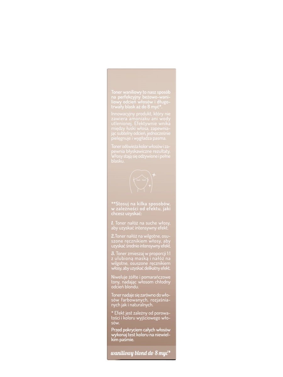 Unikalna formuła waniliowego tonera odżywia i wzmacnia włosy, nadając im jedwabistą gładkość i blask.