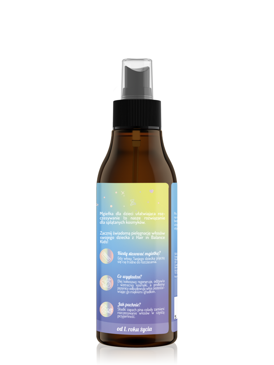 Mgiełka do rozczesywania włosów Hair in Balance Kids to wegańska i bezpieczna dla maluchów formuła, zawierająca 98% składników pochodzenia naturalnego. Nie tylko ułatwia układanie pasm, ale również je wzmacnia oraz wygładza. Koniec z szarpaniem i wyrywaniem delikatnych włosków! Od teraz czesanie będzie czystą przyjemnością, której towarzyszyć będzie zapach słodkiej pina colady.