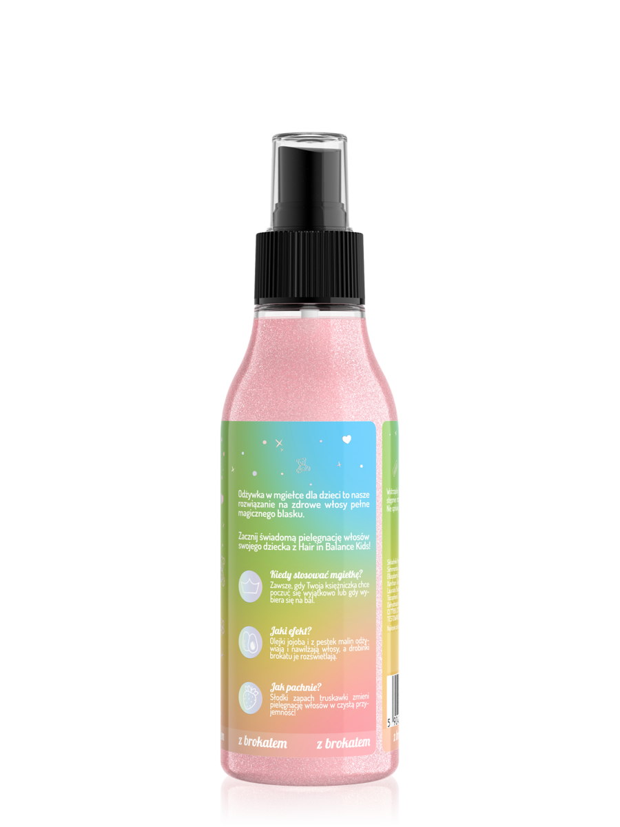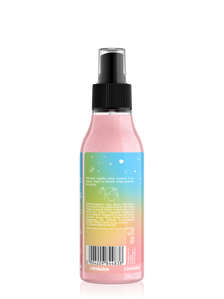 Produkt służy jednak przede wszystkim świadomej pielęgnacji delikatnych, dziecięcych włosków. Dba o ich kondycję oraz piękny wygląd, co będzie procentowało w przyszłości. Zawarte w nim składniki skutecznie odżywiają pasma, a brokat dodaje cudownego rozświetlenia. Wystarczy chwila, aby rozprowadzić mgiełkę, dlatego nie powinno być to kłopotem nawet w przypadku dzieci, którym trudno pozostać w jednym miejscu na dłużej.