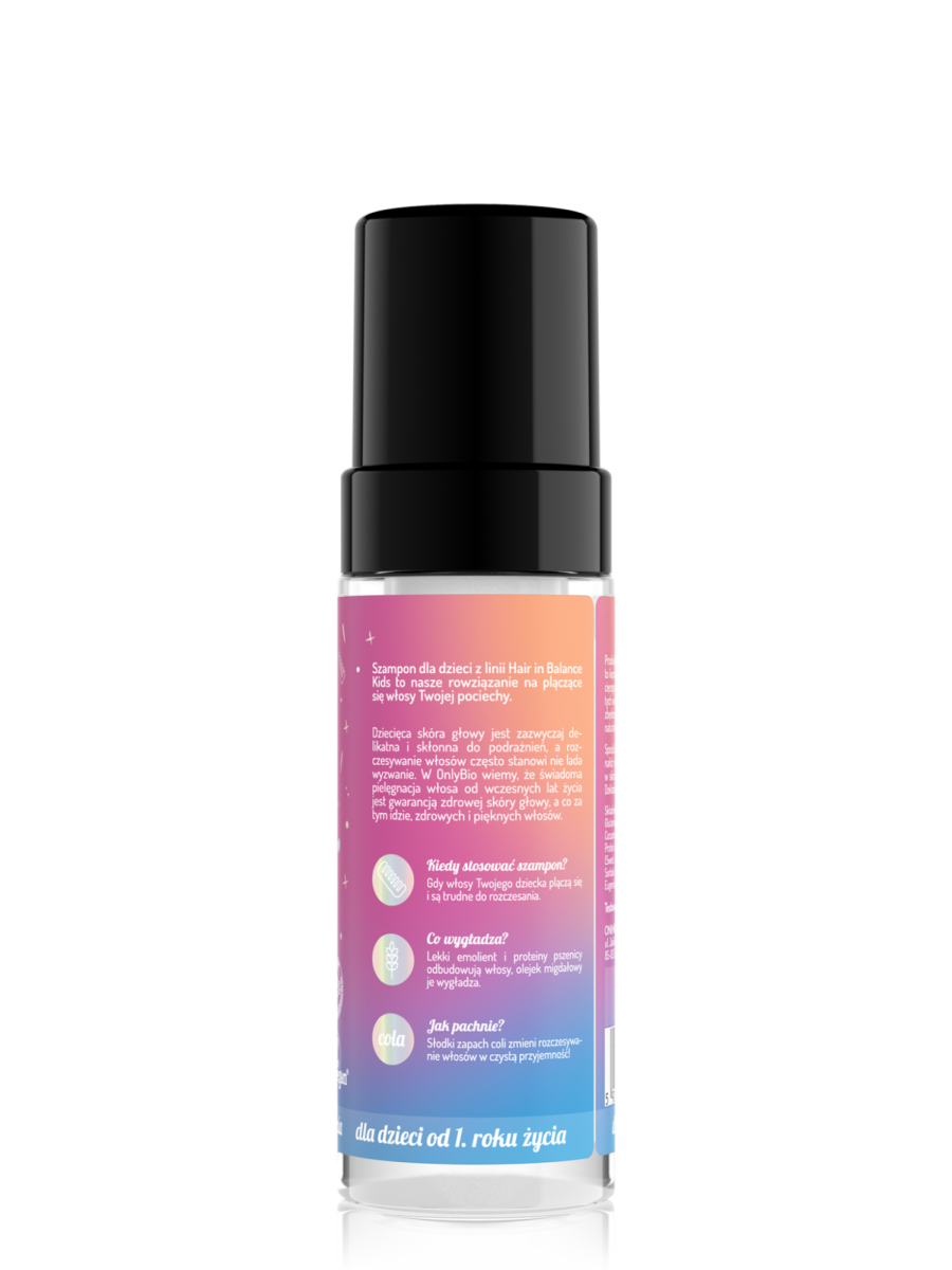 Szampon w piance ułatwiający rozczesywanie Onlybio, z linii Hair in Balance Kids, przeznaczony jest dla dzieci powyżej 1. roku życia. Ta bezpieczna formuła jest wegańska i zawiera aż 98% składników pochodzenia naturalnego.