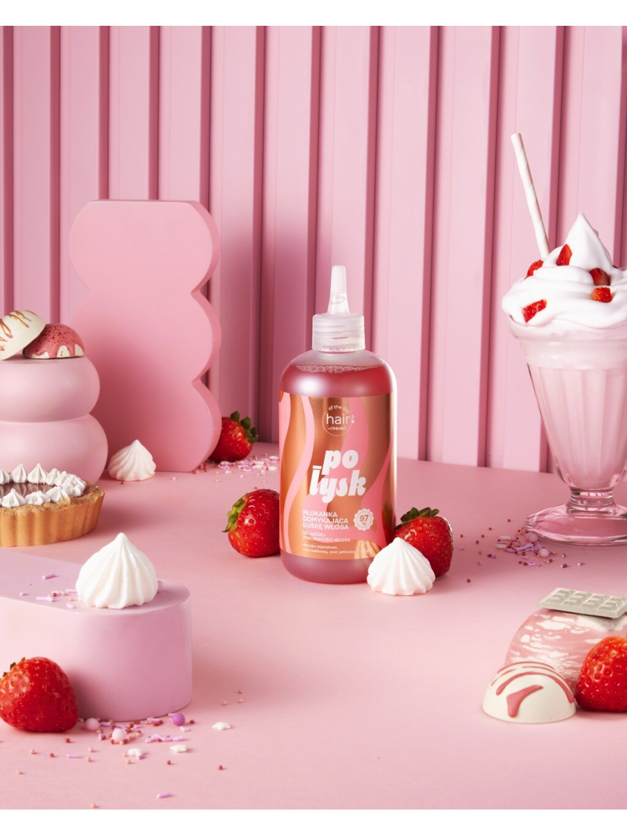 Wypróbuj nowe formuły MILKSHAKES, wzbogacone o mleczka roślinne dla pięknych włosów i maksymalnej przyjemności z pielęgnacji! Zanurz się w kremowym zapachu mlecznego shake’a z truskawkami i śmietanką! Płukanka domykająca łuskę włosa zapewnia efekt gładkiej tafli. W kilka chwil pomaga ujarzmić włosy zmiękczając i wygładzając kosmyki. Płukanka zatrzymuje nawilżenie, uelastycznia pasma nadając im super połysk. Mleczko migdałowe wzmacnia włosy i zapobiega ich łamliwości. Ocet jabłkowy nabłyszcza włosy i chroni je przed nadmierną utratą wilgoci. Ocet malinowy wygładza pasma poprzez domknięcie łusek włosa, nadając im miękkość i sprężystość.