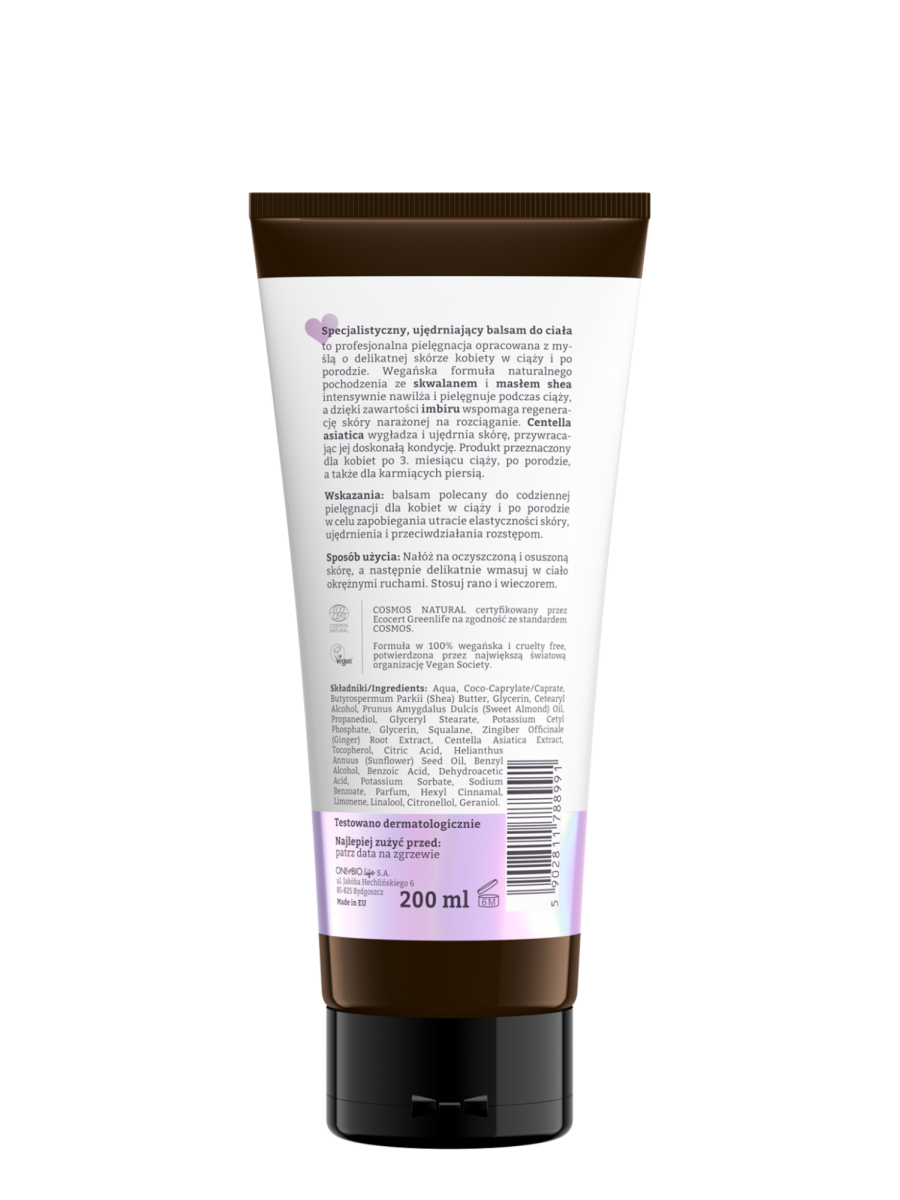 W naszym balsamie ujędrniającym zawarliśmy aż 99% składników pochodzenia naturalnego, które czule troszczą się o zmieniające się ciało. Skwalan i masło shea intensywnie pielęgnują skórę, dostarczając jej nawilżenia. Imbir wspomaga jej regenerację, zwłaszcza w okresie szczególnego narażenia na rozciąganie. Zestaw ten doskonale uzupełnia Centella asiatica (wąkrotka azjatycka), która przywraca skórze doskonałą kondycję, a także ją wygładza i ujędrnia.