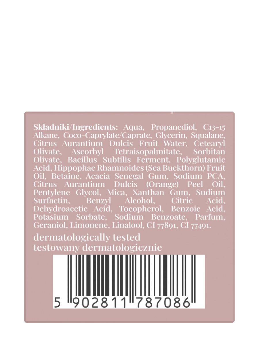 Aqua, Propanediol, C13-15 Alkane, Coco Caprylate/Caprate, Glycerin, Squalane,Citrus Aurantium Dulcis Fruit Water, Cetearyl Olivate, Ascorbyl Tetraisopalmitate, Sorbitan Olivate, Bacillus Subtilis Ferment, Polyglutamic Acid, Hippophae Rhamnoides (Sea Buckthorn) Fruit Oil, Betaine, Acacia Senegal Gum, Sodium PCA, Citrus Aurantium Dulcis (Orange) Peel Oil, Pentylene Glycol, Mica, Xanthan Gum, Sudium Surfactin, Benzyl Alcohol, Citric Acid, Dehydroacetic Acid, Tocopherol, Benzoic Acid, Potasium Sorbate, Sodium Benzoate, Parfum, Geraniol, Limonene, Linalool, CI 77891, CI 77491.