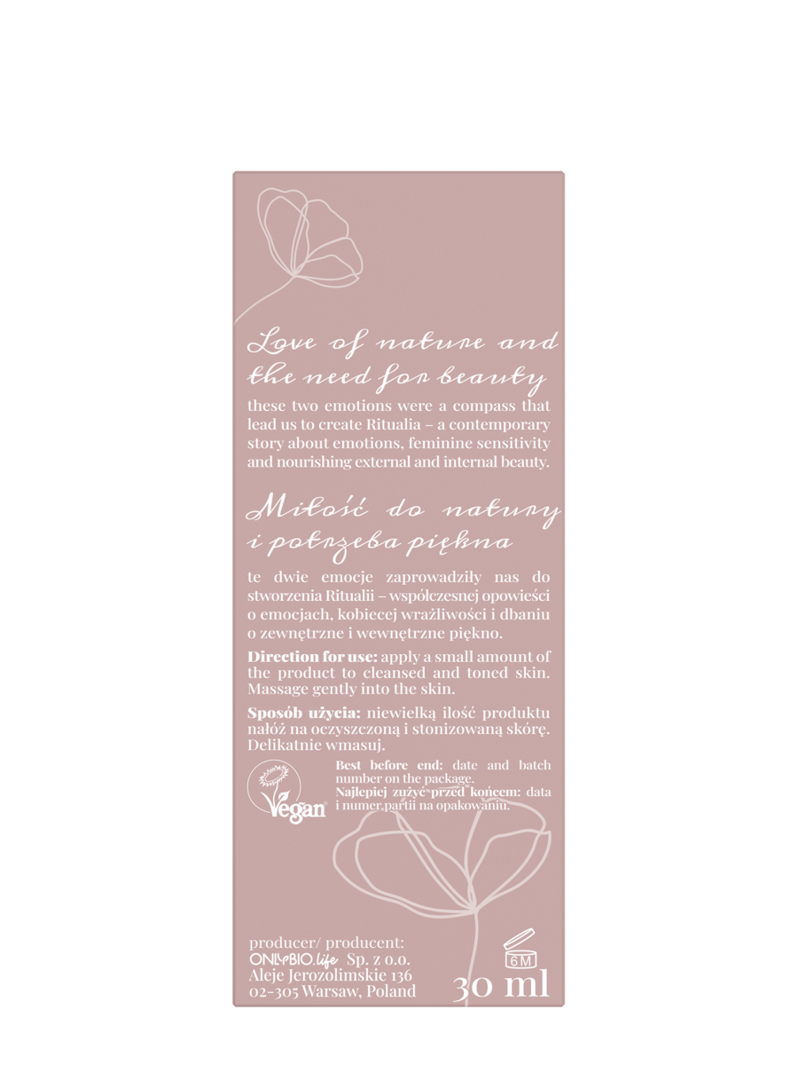Serum dodające blasku Ritualia by OnlyBio to rewelacyjna kompozycja skoncentrowanych składników, które mają dobroczynny wpływ na cerę. Intensywnie odżywiają, wspierają procesy regeneracyjne oraz polepszają kondycję skóry. Dzięki temu Twoja twarz jest promienna i pełna energii, harmonijnie łącząc się z Twoim wnętrzem.