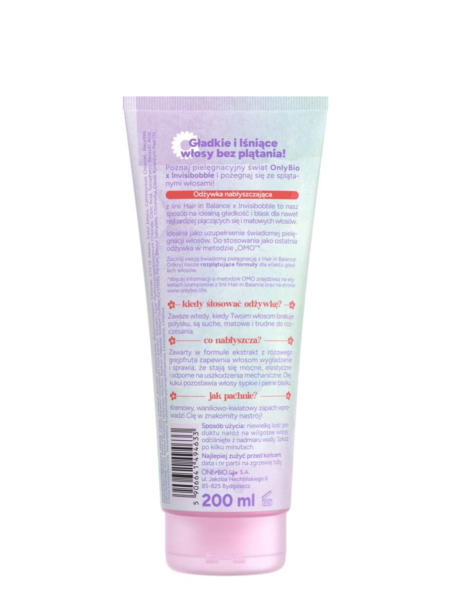 Odżywka nabłyszczająca o rozplątującej formule OnlyBio x Invisibobble to nasz sposób na idealną gładkość i blask dla nawet najbardziej plączących się i matowych włosów. Unikalna formuła została wzbogacona o ekstrakt z różowego grejpfruta i olej kukui, zapewnia wygładzenie i odporność na uszkodzenia mechaniczne, pozostawiając włosy sypkie i pełne blasku. Ułatwia rozczesywanie, jednocześnie zapewniając wygładzenie i ochronę przed plątaniem się włosów.